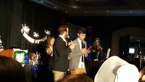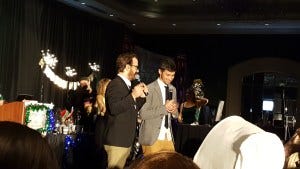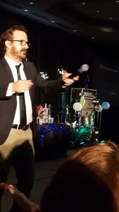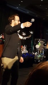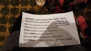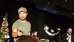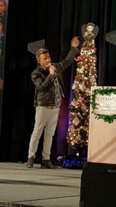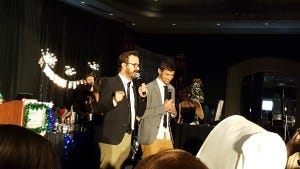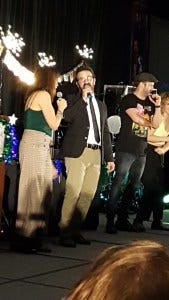 Friday night karaoke was something special – it was Richard Speight’s last karaoke. This was also the Christmas con, so the stage was decorated for the holidays and looked festive and beautiful with a banner saying ‘The Legend Has Retired’ slung above the drum set and a Christmas tree onstage decorated with ornaments that were the cast’s headshots. Priceless, DJ Liz!