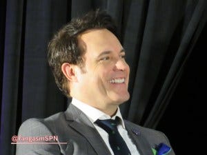 It was then time for the Mark Pellegrino panel. Mark has taken up the con gang habit of wearing his glasses onstage too – it’s been a theme of the past year. Jensen, Jared and Misha, what are you waiting for?