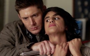Enter the trio of angel dicks, who hold the sheriff’s son hostage and order her to kill Dean if she wants her son to live. Miriam and Dean engage in some verbal sparring first, which turns poignant when she says that Jack can do almost anything. You can see the moment when Dean thinks that might mean bringing people (or angels) back from the dead, because Ackles can show us that in a split second, and then she brutally quashes it, assuring Dean that Castiel is 100% dead – and that it’s his fault.