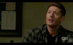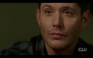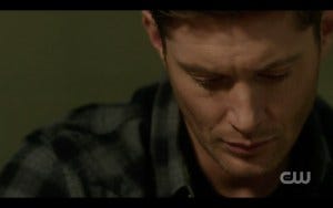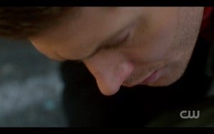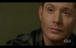 That scene, like the scene with Rowena, worked so well because Jared tapped into all the emotion he needed to and let us see very bit of it, and Jared’s scene partner was instrumental in making it work. Jensen showed us a Dean who was able to put aside his own not-always-functional coping strategies in order to try to give Sam what he needed. Dean shoves things down too, and then covers them over with snark and teasing and not taking serious things seriously because it’s too uncomfortable and feels too dangerous. He’s afraid, always, that Sam will fall apart – that the terrible things that he knows have been done to his little brother will take their toll and Sam won’t be okay once again. It’s happened before, and Dean was so desperate to fix Sam that he let Gadreel inside to do it, with horrific results. Dean too is struggling with his own helplessness, and yet he too is courageous and puts his own feelings aside for Sam. Thanks to the writing and to Ackles’ intimate understanding of both his character and Padalecki’s, he shows us a Dean who is almost muted in presentation, a striking contrast to Dean’s usual persona.