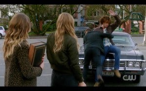 Dean merrily brings the grimoire to the witch sisters and obediently closes his eyes for his reward kiss (which come with a bludgeoning instead of a kiss because the witch sisters are clearly insane). Though they do have good taste in cars, since they complain that Dean didn’t bring Baby. Here she comes to the rescue though, the Impala and Sam arriving just in time to save Dean from meeting a fate similar to the poor convenience store guy. But Dean isn’t exactly appreciative, and that means we get Sam tackling Dean and the boys wrestling on the hood of the Impala and me laughing my head off. The call back there was to the brothers’ wrestling on the bed in Tall Tales, and this was similarly priceless. You get the feeling that Jensen and Jared enjoyed every moment of filming that scene, letting their inner five year olds out to play with abandon. And guess what? I enjoyed it just as much!