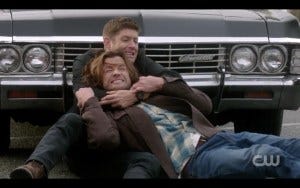 Kim on Dean’s knock out of Sam: It was established in the pilot episode that Dean will always beat Sam in a fight. Sam wins rock-paper-scissors, Dean wins the brawl. Yes, there have been exceptions, such as when Sam was hyped up on demon blood and he kicked Dean’s ass – but, um, Demon Blood. Plus, they are brothers! Do you think that Dean doesn’t know exactly how and where to hit Sam to knock him out? If anything, Sam should’ve seen it coming!