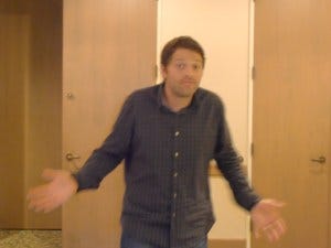 It was. So long winded that Misha was chastised by The Powers That Be for being late for some phone interviews and we were chastised for making him late. Hey, we were the ones BEING interviewed half the time, it wasn’t our fault! Anyone who has had the pleasure of seeing Misha at a convention knows that he took on the experience with the same intellectual curiosity he brought to our first interview. Sometimes his Q & As are so hysterical that we’re crying from laughing so hard. He broke the rules early and often (huge surprise there….) and in the process changed the norms for cons, and for the ways in which the creative side interacts with fans. He treated fans like fellow adults, asking as many questions as he sorta-kinda-maybe answered (a dynamic with which we were already intimately familiar), tossed out the no-cursing norm, and generally engaged in witty banter that some fans matched him step for step and others just quirked an eyebrow. When we sat down with Misha at the Chicago Supernatural convention this past November, we asked him what made him push those boundaries so soon.