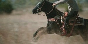 We see the slice in the girth of Cordell’s saddle as the horses and riders gallop away.