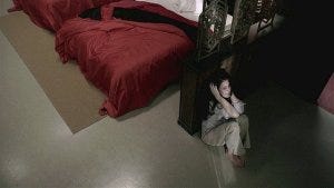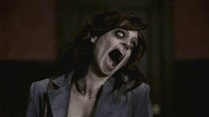 Sure enough, we see Dr. Pearlman huddling on the floor of her hotel room, screaming as something tries to get in the door. In the best horror movie fashion, there’s a lull in the pounding and she looks up – and of course an invisible hell hound leaps through the window and grabs her, invisible claws tearing up her leg as it pulls her across the floor to her death – and to hell.