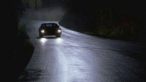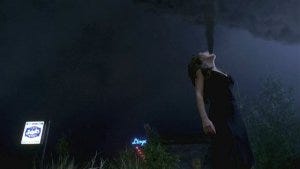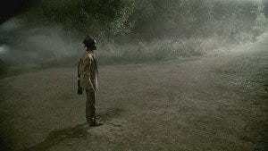 The man pauses when he hears wolves baying outside, then growling, and we see a woman in the audience growing increasingly worried about him. He resumes playing, startling as we see shadows outside the window, the growling getting closer. The cigarette he’s been smoking falls from his mouth and the man looks terrified as he runs out of the place and down the road in the middle of the night, pursued and surrounded by unseen creatures. The trees shake with their bulk, and we hear their growling and barking. The man drops his guitar and runs, hiding in a deserted barn and locking the doors behind him.
