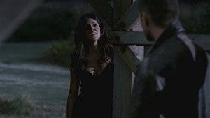 Dean keeps backing up, looking anguished (and hot as hell). She keeps coming until he’s backed up against a wooden beam as she advances on him. Finally he asks, looking close to despairing, ‘what do I need?’