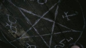 She looks up to see a devil’s trap on the ceiling painted on the wood.