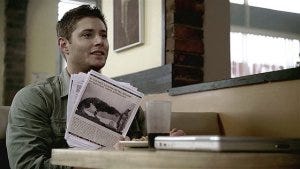 Sam finds a mugshot of Dean online and Dean preens, saying he’s like Dillinger or something. Sam warns that it makes their job harder since they have to be more careful, and Dean snarks back that they don’t have anything on Sam.