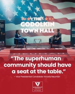 Cameron Coleman takes over the interview – never mind, nothing to see here – grilling Neuman about Stormfront slaughtering people and Soldier Boy nearly killing thousands in NYC. He accuses her agency of persecuting the minority group – Supes. Neuman counters that if elected, their government will give the superhuman community a voice – a seat at the table.
