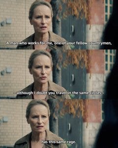 The audience starts chanting “you will not control us”, Sam initially bewildered by all the anger. Rufus tells him that Homelander is right, that they’re trying to take away their power, and Sam starts to get swept up in it, finding an outlet for all his own rage at the people who tortured him for all those years. Emma finally finds Sam, who was quite charmed by everything including Rufus.