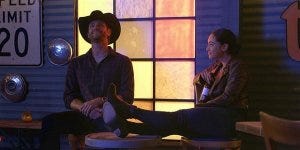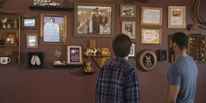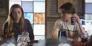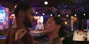 Back at the Side Step, Trey teaches August to flip bottles, then fumbles one and it shatters, and we realize he’s still having issues with his hand coordination. He helps Augie finish the memory wall with a memento from his first date with Micki, sharing a sort of heroic story and then wondering if “that guy’s still here anymore,” having a bit of an identity crisis after his injury.