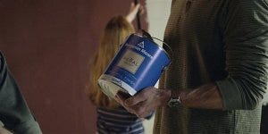 Bonham opens a can of strategically featured Benjamin Moore paint while music plays and Cordell looks at him skeptically.