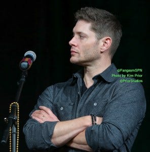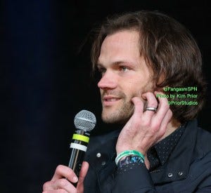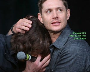 The panel ended with a sweet moment between Jared and a fan. She asked for tips on how to be happy. Jared sat down at the edge of the stage as he talked about being away from his family, and that is a hard thing sometimes, but he also thinks being at the cons is good for his mental health too, so he believes it’s a balancing act. As Jared spoke, Jensen listened quietly, but then he walked over to Jared and put a supportive hand on his head, then ruffled his hair, because, ya know, big brothers never resist the chance to mess up little brother’s hair.