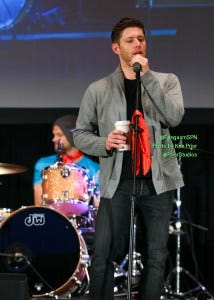 The Gold Panel began with Jared and Jensen walking onto the stage, both carrying coffee. Jared immediately announced: “Jared, 0. Nashville, 1.” After the concert last night, Jensen texted Jared to ask to go out for a nightcap. Jared was already asleep, texting ensued, and their night began.
