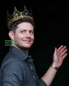 [In case you forgot… in March of last year, just before this con, Jensen reigned as King Bacchus at Mardi Gras. For the morning Gold Panel, the stage and mics were decorated with Mardi Gras beads, and most fans wore gold crowns as we sat in the audience. Jensen quickly went backstage, and returned wearing his crown.]