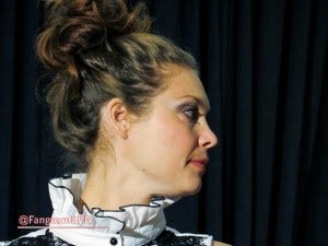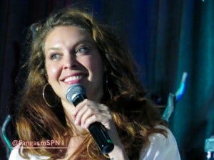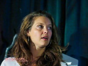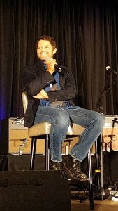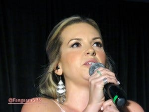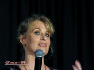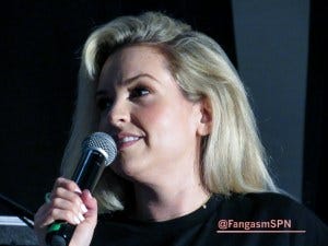 Next up we had Mary Winchester herself, Samantha Smith, looking way more stylish than Mary usually does. Samantha has a running joke about being clumsy (“my husband says I am…”) and has some amusing anecdotes from set to prove it. The fight scene she and Lizzie Bee had with Jared and Jensen early on was, as Sam put it, “a hot mess.” Including poor Jensen getting hit in the face!