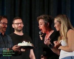 Pittcon was also Kim Rhodes’ birthday weekend, so the panel ended with a surprise birthday cake. Poor Richard Speight had been standing offstage ready to bring it onstage, candles burning, for way too long as Briana gave her emotional answer that he didn’t want to interrupt. Hence a very waxy birthday cake and a very surprised Kim, who blurted out “Whose birthday is it?”