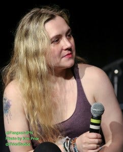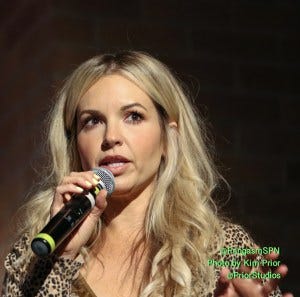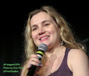 The first panel of the day was Rachel Miner. Apparently she’d had a rough day, dealing with flight delays among other things, but she said she didn’t even care, because she knew she was coming to be with her #SPNFamily. Aww.