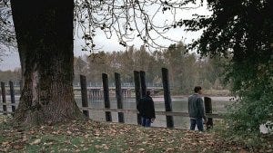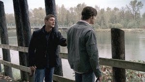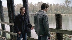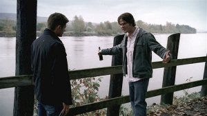 From that disturbing beginning, we’re back at the iconic fence with the Winchesters, Sam and Dean drinking beer next to the river.