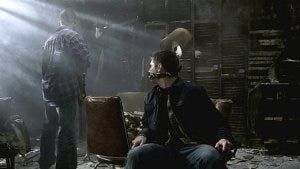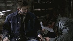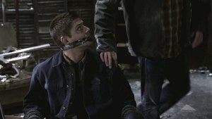 Dean pulls off the gag, still frantic, and immediately grabs Sam and pulls him up to his feet. He cradles Sam’s face, all big brother tenderness, assessing carefully to make sure Sam’s okay. Sam speaks the same nonverbal language, nodding at Dean and then touching him on the shoulder in reassurance.