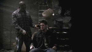 He aims at Sam again, and suddenly Dean jumps him from behind and throws him down, punching him repeatedly and yelling threats.