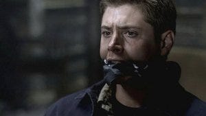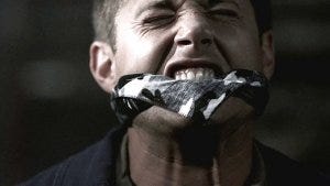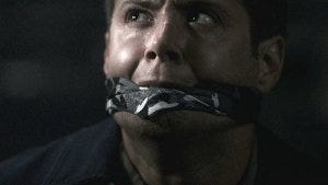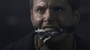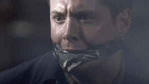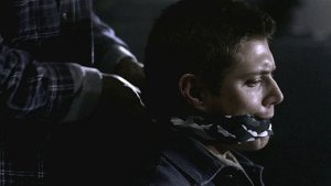 He pulls out a scarf and gags Dean, so rough his mouth is pulled back painfully and damn Jensen, that’s taking one for the sake of this show being too damn real sometimes.