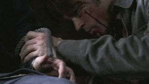 He’s enjoying this, relishing it. A hunter about to take down his prey. Dean struggles again, and then there’s an explosion, Dean screaming ‘Sammmm’ behind the gag.