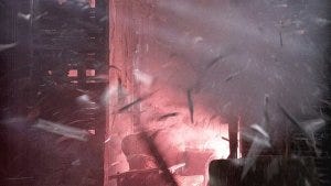 We see him break into an old house or building of some kind, walking carefully in the dark – when suddenly he steps on a trip wire and the place blows up, Sam screaming.