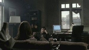 Back at the motel, Ava tries to talk Sam into leaving town before he gets blown to bits but Sam insists he’s got to figure out what’s going on. Ava would rather get back to planning her wedding and being a secretary from Peoria, but Sam is persuasive. She schedules a therapy session with Scott’s psychiatrist to cover for Sam trying to break into his office records. The scene where Ava tells the doc she’s super anxious and then suddenly blurts out “Holy crap!” as she sees Sam creeping along the window ledge outside is priceless. And Ava proves herself an adventurer at heart – which will eventually not be a very good thing for Sam. Or her fiancé.