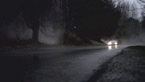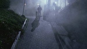 Scott leaves the doctor’s office and walks out into the dark, clouds of mist hanging over the deserted street as he rushes down a hill, hunched over, looking scared.