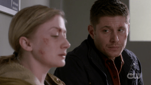 Once again, Ackles does an amazing job portraying Dean’s shock and grief. He looks almost like he’s been stunned, unable to process the full weight of what he’s lost. He looks up at Michelle like her every acknowledgement of that loss hurts him physically. He can barely look at her; he flinches, eyes watery. The damage done to Dean Winchester is horribly, strikingly obvious.