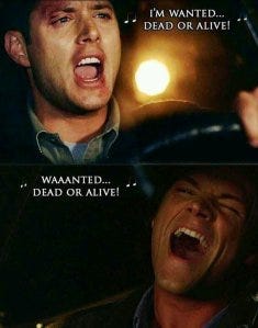 Corey: I won’t be happy until Sam and Dean jump a shark though, like literally. I’m so ready for them to go up against a zombie shark or something (cracking up)