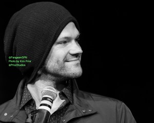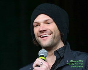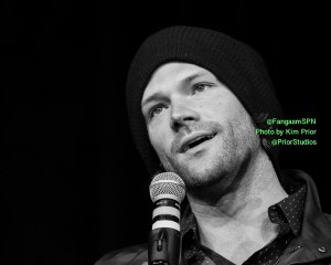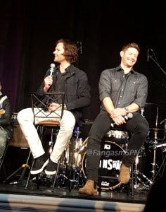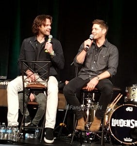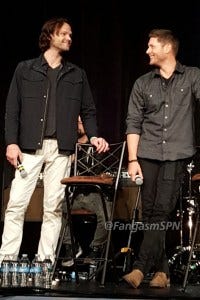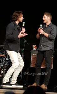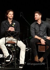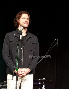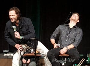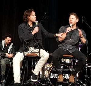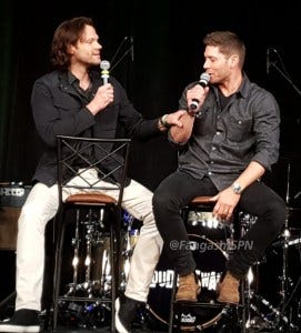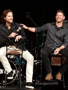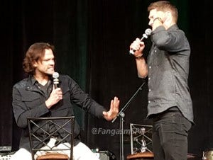 Jared and Jensen were in an amazingly good mood in the afternoon panel, constantly teasing each other and slapping each other with “OMG remember when” comments, and making each other laugh every other sentence, including ribbing each other about how old they are.