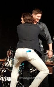 Jared gave her a hug and Jensen joked that everyone on that side of the room was screaming “Jared, Jared, I’m 13!” to get a hug. He acted that out, so Jared promptly ran over and gave Jensen a giant hug. My favorite part is the look on Jensen’s face as he realizes Jared is coming in for the hug, just this pleased expression that says so much about their friendship.