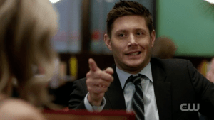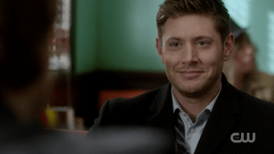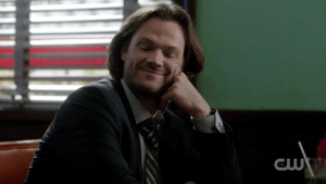 Sam’s face though, so long suffering and yet so fond. I’ve said this before but it bears repeating – it’s the actors’ ability to show so much with so little that makes this show so incredible. Jared shows us a Sam whose affection for his brother is evident right there in his expression – he’s put upon, sure, but he’s also happy just to see Dean smiling and alive and sitting across from him. It’s those subtle acting choices that bring the bond between the brothers to life and makes their relationship so compelling.