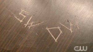 And also in true horror movie fashion, the person who foolishly decides to strike out on their own gets taken down – in this case, Dean has the gun knocked away and then is tossed right off a staircase! Ouch! The bad guy (who turns out to be the other brother, raised in a double wide instead of the big house and still pretty pissed about it) restrains Dean in an office chair by wrapping him in saran wrap….which is a pretty creative way to do that….and probably shouldn’t make me think of anything other than poor Dean, but come on, this is Dean Winchester we’re talking about. Anyway, bad guy wheels Dean right into the cold storage with the monster, after turning the Winchester family slogan into something horrible.