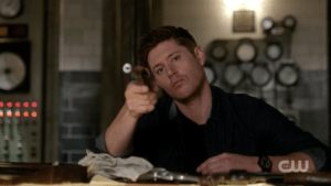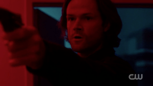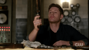 I’ll get to that wonderful scene soon, but I loved the entire episode. This was an old school Supernatural monster-of-the-week episode, reminiscent of the early seasons in so many ways. I liked the twists and turns of the case, first thinking it was a monster, then a human, then lo and behold it ended up being both. Bring didn’t forget Castiel either. We got another Cas phone call, leading up to the next episode when Castiel reappears. And we got Dean cleaning the Colt and then aiming and fake firing it, which never fails to do things to me.