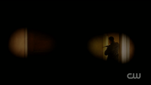 In true horror movie fashion (and true Dean Winchester big brother fashion), Dean tells Sam to stay put and stay safe with the sheriff, while he goes upstairs to see who/what is making noise up there, armed with the Colt. That was a creepy creepy scene, Sgriccia showing us Dean with gun drawn trying to figure out what’s going on, through the cut out eyes of the goat mask. I was biting my nails waiting to see what would happen.