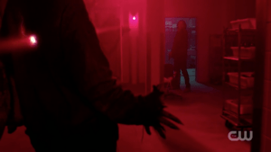 The scenes in the meat locker are also beautifully filmed, lit up red and dark enough that we can’t see clearly – which makes the monster lurking in the corner all the more scary. Dean, badass that he is, wheels himself around and then slips out of the saran wrap and arms himself with a meat hook.