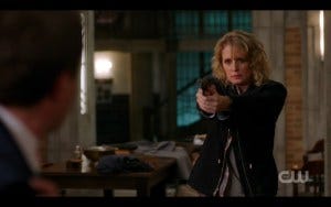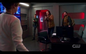 Meanwhile, there’s no rest for the overly excited fan viewer (i.e. me), because there’s a parallel fight going on with Sam and Jody and their band of hunters versus the BMoL at their warehouse. The directing is top notch here, with me biting my nails as Sam and Jody shoot their way into the place, dodging bullets all the way, because we didn’t know if Jody was going to survive and OMG I really wanted her to! Both Sam and Jody are big damn heroes here, fearless and competent and kickass, just like Alex said.
