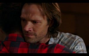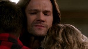 Sam and Mary hug, and the camera shows us Dean. And Ackles shows us everything Dean is feeling right then – overwhelming relief that his brother came back and is okay, that his mom and his brother are alive and together. He clasps his hand on Sam’s shoulder.
