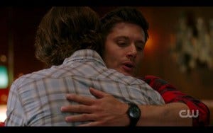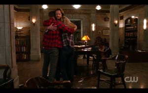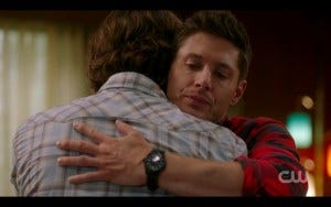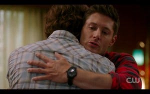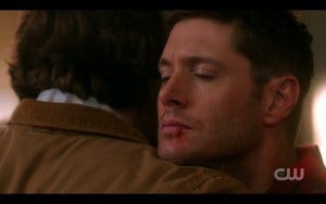 And then it happens. That thing we’ve all been waiting for for an entire long season. THE HUG. Dean pulls Sam in for an epic bro hug, and I absolutely dissolve in a puddle of tears, trying to both sob and smile at the same time with probably very unattractive results.
