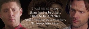 Dean: You lied to me. You promised you’d keep me safe and then you make a deal with Azazel…You left us. Alone…Dad was just a shell… And I had to be more than just a brother. I had to be a father. And a mother, to keep him safe. And it wasn’t fair…and I couldn’t do it.
