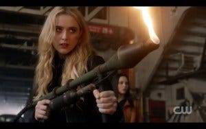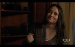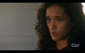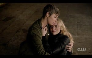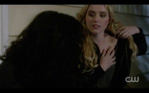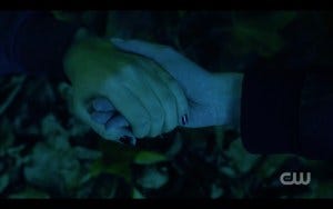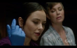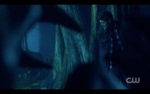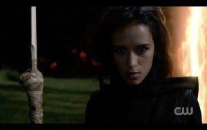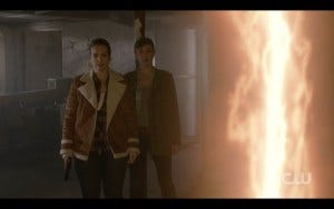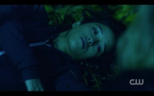 There was a fair amount of controversy over whether the most experienced hunters in the world (the Winchesters) should need saving, but in fact they’ve gotten themselves in impossible situations before and had someone come to their rescue. True, Claire is not anywhere near as experienced a hunter, but she had the guts to go in after them and sometimes that’s all it takes. Claire and Kaia get there just in time and they all run for the portal, and very nearly make it. At the last second, the shadowy hooded figure appears and for some reason they all pause instead of just jumping through the portal. Hooded figure thus has time to toss a spear at Claire. At the last second, Kaia jumps in front of her, saving Claire but getting hit herself. As she lies dying, Claire holds her hand, stricken.