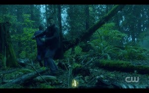 The AU really is scary, btw. It takes a lot to make the Winchesters look small, but they did. Also unfortunately for the Winchesters, it seems like they’re unarmed in the AU (I think?) and the mysterious hooded figure hunting them is not, so they both get knocked out and wake up tied to trees. (Yes, that fight seemed a bit too easy, and I think we could have had more kickass Winchesters and that wouldn’t have taken away from kickass Wayward Sisters, but I’m going with some AU powers or something here). I also sort of raised my eyebrows at their discussion about finding the portal, because OF COURSE they’d be looking for the portal! Did they somehow land far away from it? I don’t know, and Show didn’t tell us, which is a bit of a plot hole. Anyway, they wake up tied to trees. That means we get to hear Dean yell “Sam! Sammy! Hey, hey….” which is how the Winchesters always immediately check on each other after something bad has happened, so that made me happy.