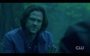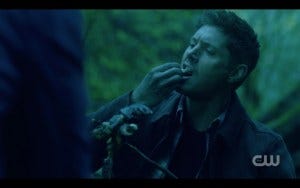 As is often the case with Supernatural, Berens managed to include some humor in between the scary and the emotional in this scene, namely Dean chowing down on a lizard they’ve managed to hunt and roast. This gives Jared a chance to make a patented Sam bitch face.