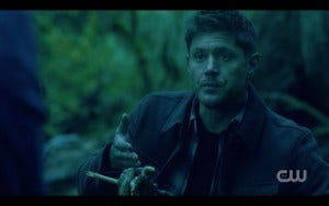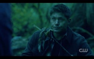 I was already laughing when they hear someone coming and take off, but I really lost it when Dean turned around and ran back to retrieve his lizard meal. I like to play a game of trying to guess which moments are unscripted, and I put my money on that one – sure enough, Jensen Ackles confirmed at the convention that he’d adlibbed the running back for it.