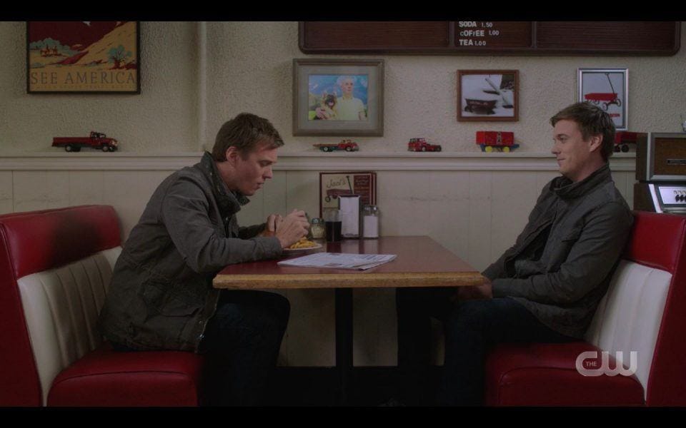 Flash to another scene, a diner called “Jaci’s Red Wagon”, an homage to Richard Speight’s wife Jaci. We all knew Jake Abel was returning as Adam/Michael, so it was no surprise to see him, but I had no idea his performance would be such a tour de force. Holy shit, that guy can act! When they were filming this episode, Jared and Jensen both said that Jake was so good that they had to up their game to keep up with him, and now I see why. He played both Adam and Michael – having a conversation with each other no less – and there was never a time you couldn’t tell exactly who he was. Everything changed – facial expressions, way of sitting, voice inflection, emotionality, formality – everything! Brilliant.
