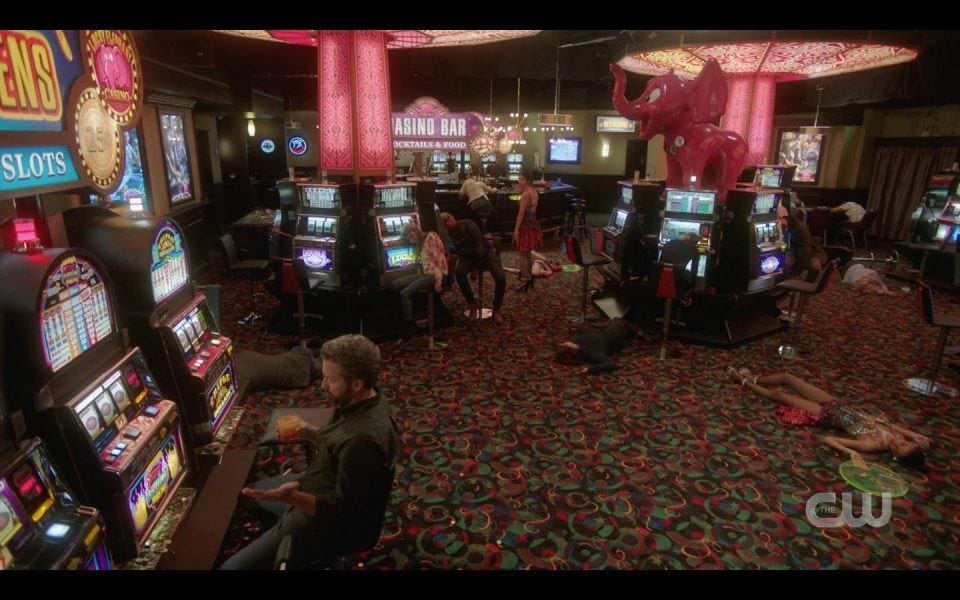 The first scene was pure Speight, a visual example of why I like his directing: a decadent casino, the floor littered with dead bodies. A terrified cocktail waitress carefully steps over her former colleagues and customers, balancing a drink – which she serves up to Chuck (of course). I loved the way the scene was filmed, full of dark humor and an undercurrent of genuine fear because it’s clear that Chuck could snap at any time. God is bored, engineering constant wins but without any surprises, and that’s making him cranky.